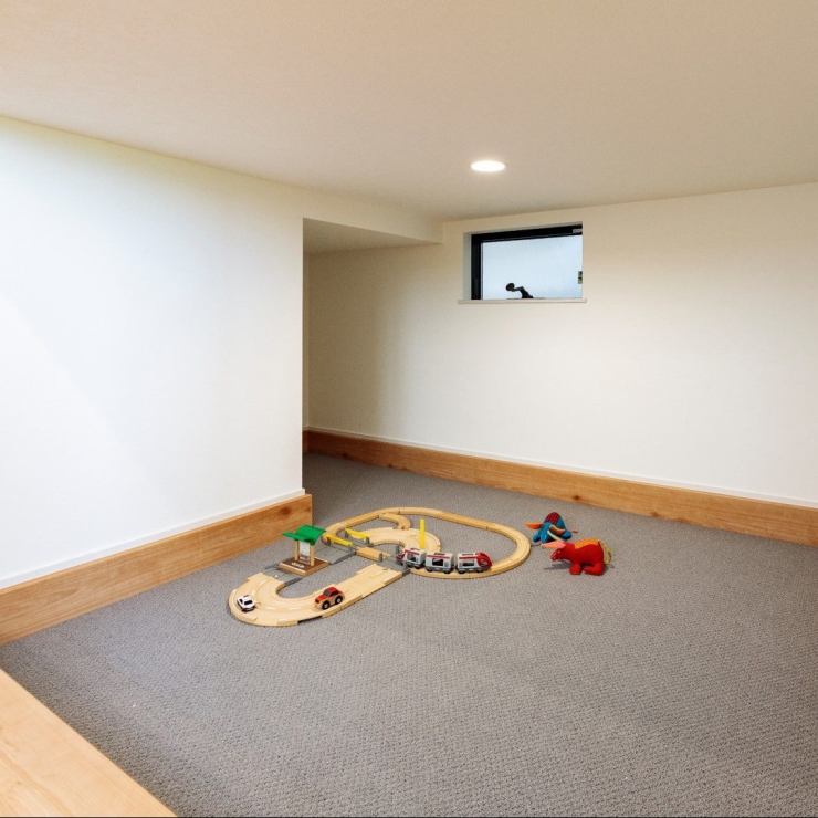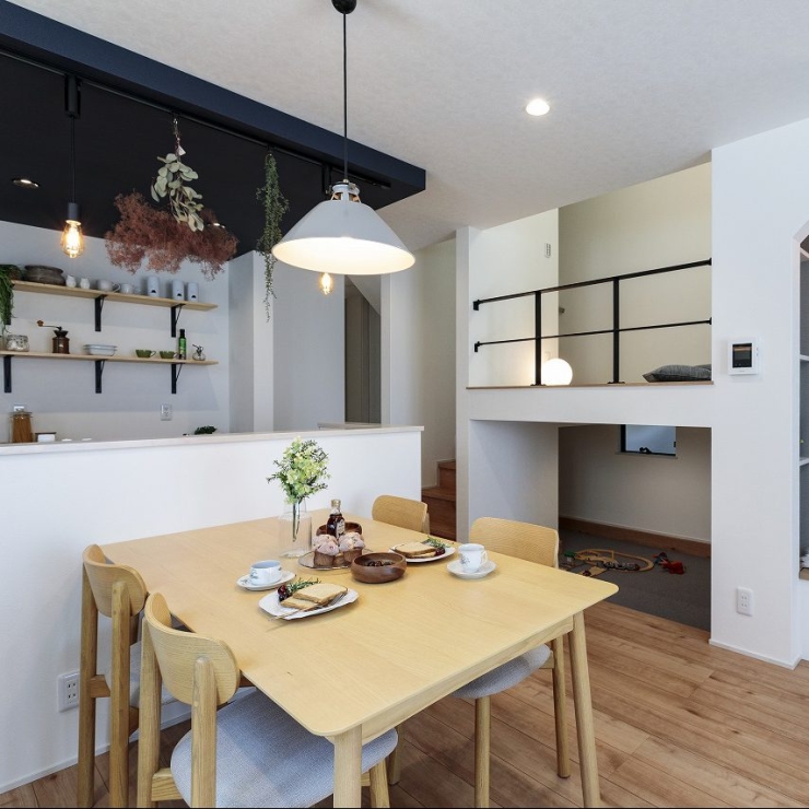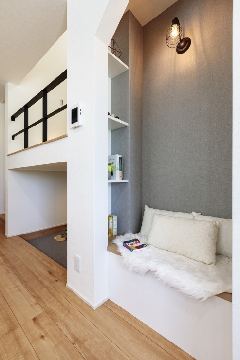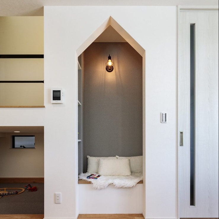 スキップフロア隣三角屋根の家の形をしたのヌックは、身体がすっぽりと入る安心感のある空間。 家族とのつながりを感じながらも、自分だけの時間を楽しめる奥様お気に入りのスペースになっている。