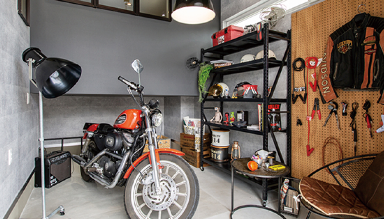 バイクいじりやDIYの秘密基地、アトリエとして大人の時間を思いのままに楽しめるガレージを中心とした設計。