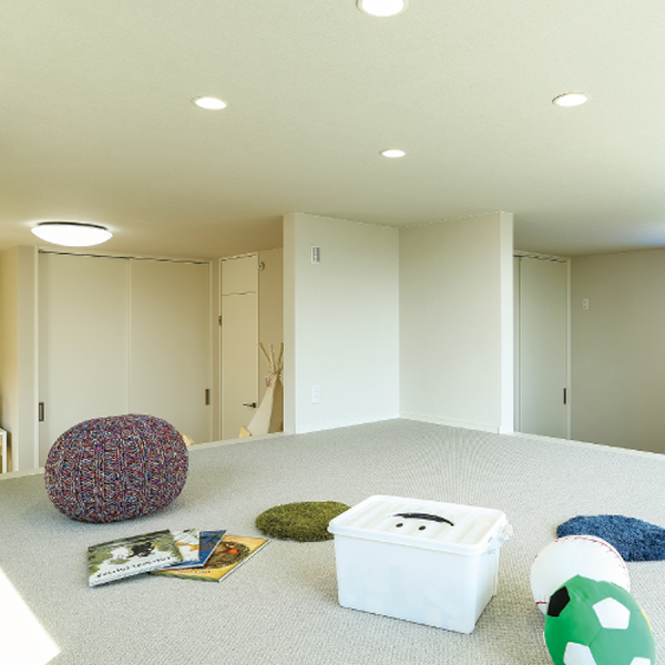 子供の遊び心をくすぐるわくわく空間 土高さ1.4mの大収納スペースは子供部屋から入れるわくわくスペース。パパと子どもたちの遊び心をくすぐります。