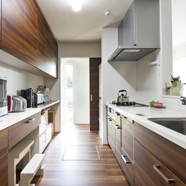 キッチンは背面収納も豊富なので片付けがラクラク。家事をしながら、リビングや畳スペースのお子様の様子が見通せるため安心。