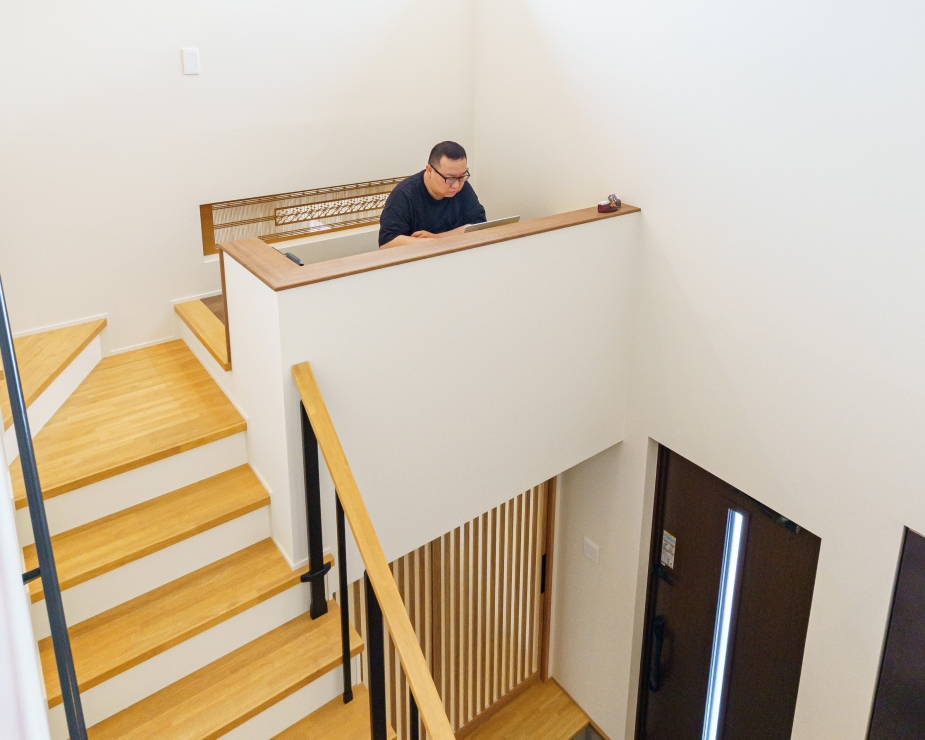 明るい光が降り注ぐ吹き抜け空間に、視覚的な繋がりを保ちつつ独立性も確保したスキップフロアの書斎スペース。