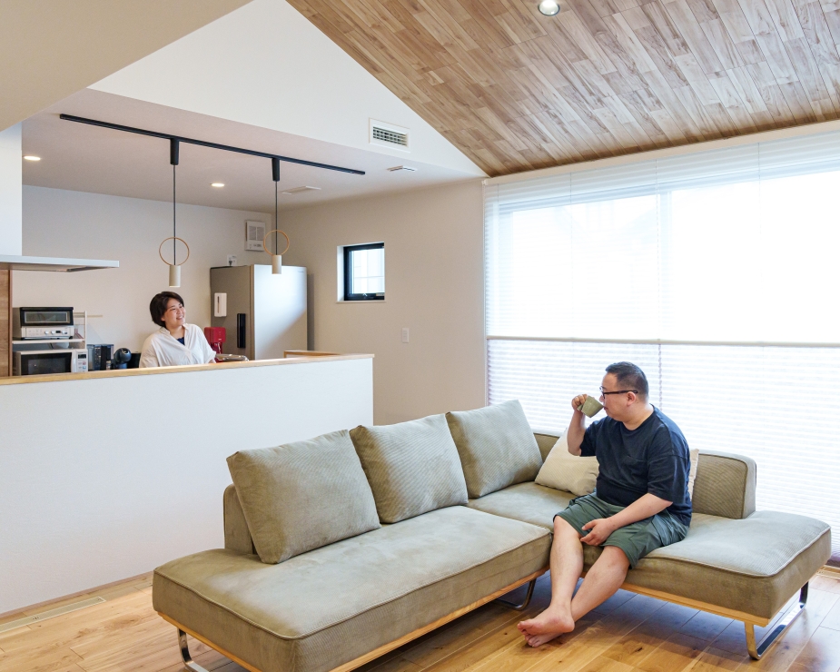 勾配天井と木目の天井材が空間に広がりと温かみを与え、家族が自然と集まる居心地の良い空間です。
