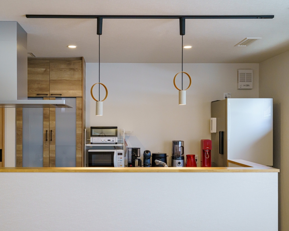 こだわりのペンダントライトが彩る、カフェスタイルのキッチン