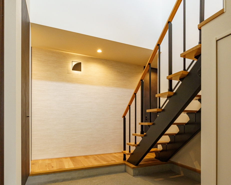 帰宅するご家族や訪れる人を暖かく迎え入れる玄関スペース。温かみのある木目の床と、壁の間接照明が心地よい雰囲気を演出します。