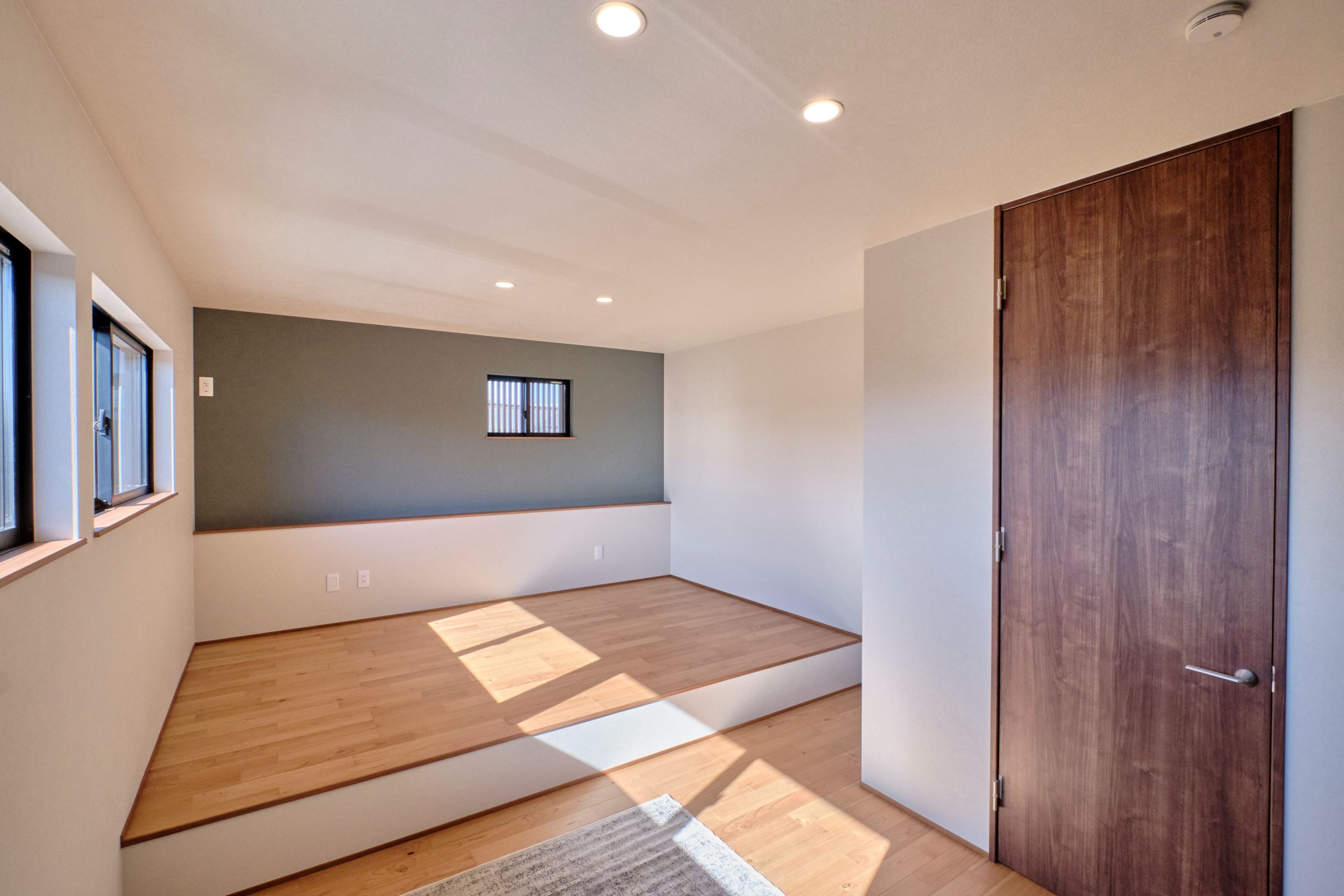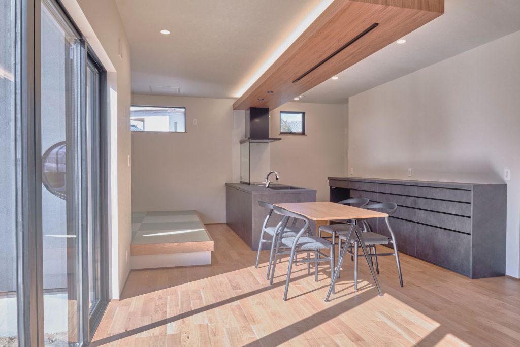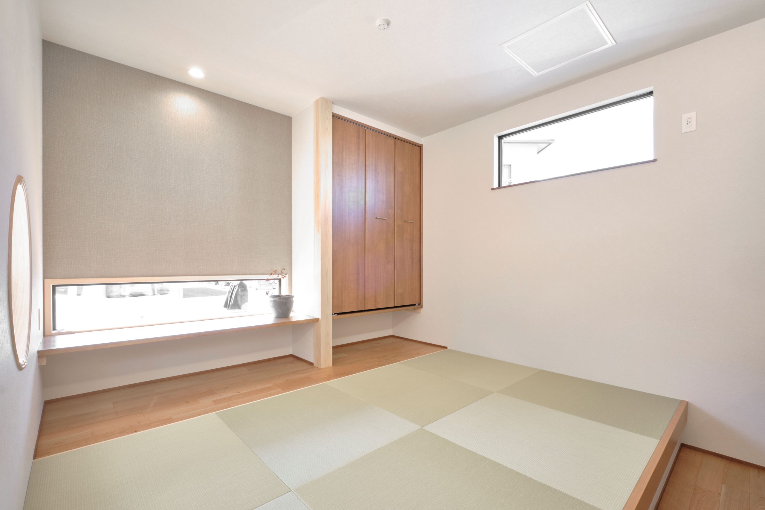 窓の形と配置にこだわりがつまった和室。カウンターにフィットした窓。丸形でかわいい窓。目線を意識した配置になっている。収納もあり便利。