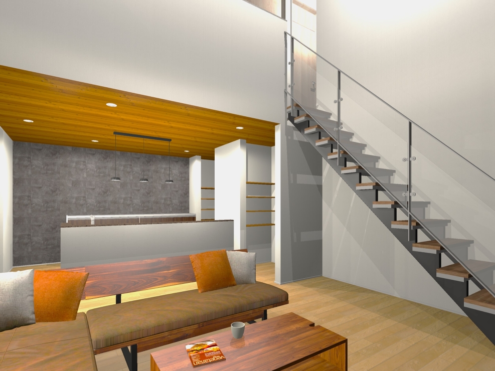 縦へと伸びる開放的な空間にはリビング階段を設け、どこにいても家族の気配を感じられる一体感のある間取りに。天井の温かな木目と、壁面のシックなグレーのコントラストが、洗練されたモダンな雰囲気を演出します。