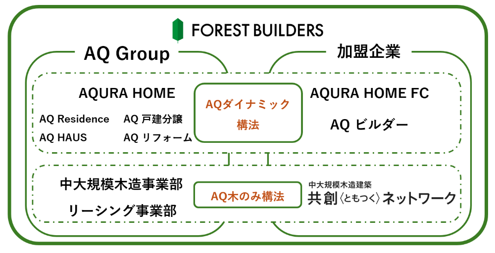 弊社は2024年に、日本最大級の木造建築集団を目指す「フォレストビルダーズ」を結成しました。「フォレストビルダーズ」には、弊社オリジナル技術「AQダイナミック構法」で戸建て住宅を建築する外部組織「アキュラホームFC」とボランタリーチェーンの「AQビルダー」があります。一方、同じくオリジナル技術の「AQ木のみ構法」で中大規模木造建築を担う外部組織が「中大規模木造建築 共創〈ともつく〉ネットワーク」です。「ともつくネット」は主に4階建て以上の木造オフィスビルや木造マンション、大型倉庫などを手掛ける団体で、中大規模木造建築に強い志を持つ、地場建築企業を加盟対象としています。加盟企業には弊社が20年以上にわたり蓄積してきた中大規模木造建築技術「AQ木のみ構法」をライセンス契約で提供。また、加盟企業同士が互いの情報を共有し、技術や知見を高め合う場も提供します。さらに、組織力を生かし技術だけでなく、中大規模木造建築を活用した経営を学ぶ機会も用意。3つの価値で加盟企業を促進し、中大規模木造建築の普及を目指していきます。