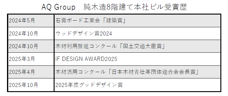 株式会社AQ Group(本社:埼玉県さいたま市西区、代表取締役社長:加藤博昭)が手掛けた、純木造8階建て本社ビル(埼玉県さいたま市西区三橋5丁目976-1)と、純木造4階建てマンション「AQ FOREST 大宮桜木町」(埼玉県さいたま市大宮区桜木町4丁目883-1)が10月15日、公益社団法人日本デザイン振興会主催の「2025年度グッドデザイン賞」(オフィス・産業施設の建築・環境部門)・(小規模集合住宅部門)でグッドデザイン賞を受賞しました。いずれも、日本古来の在来軸組工法をベースにした“普及型”モデルで、CO2削減や森林循環を促すなど、社会的意義のある取り組みとして高く評価されました。
