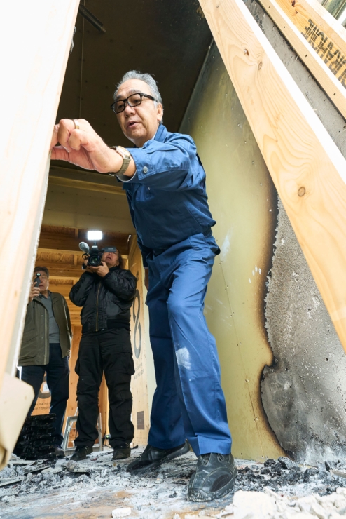 今回の耐火実験には、木造建築防耐火研究の第一人者である安井昇氏(桜設計集団一級建築士事務所代表)が参画。「住宅火災は、いかにして燃え広がりを留めるかがポイントになる。省令準耐火構造というのは、木造であっても鉄筋コンクリート造であっても、火災が発生した部屋1カ所で燃え広がりを留めることが重要であるという考え方。AQ Groupが行った今回の実験では、壁の中などに火も入っておらず、しっかりと1カ所に留めていることが実証された」と話しました。