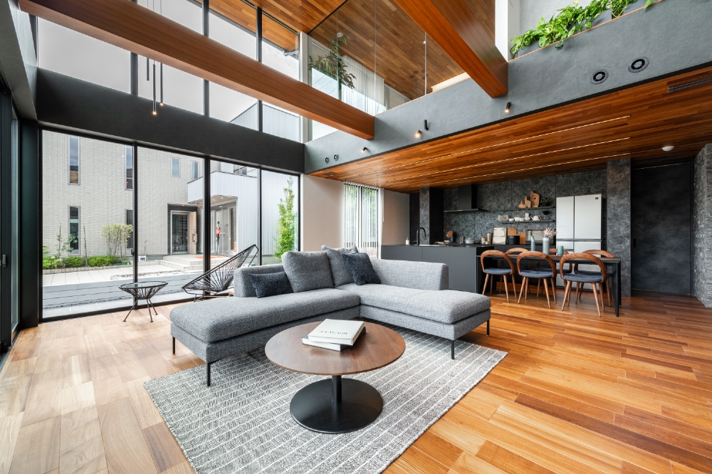AQダイナミック構法:木造注文住宅において、高耐力壁を外周に配置することで室内の不要な壁や柱を取り除き、自由な間取りや超空間と高耐震性を両立させたAQ Group独自の技術。「アキュラホーム」をはじめとする弊社の注文住宅はAQダイナミック構法で施工されている。