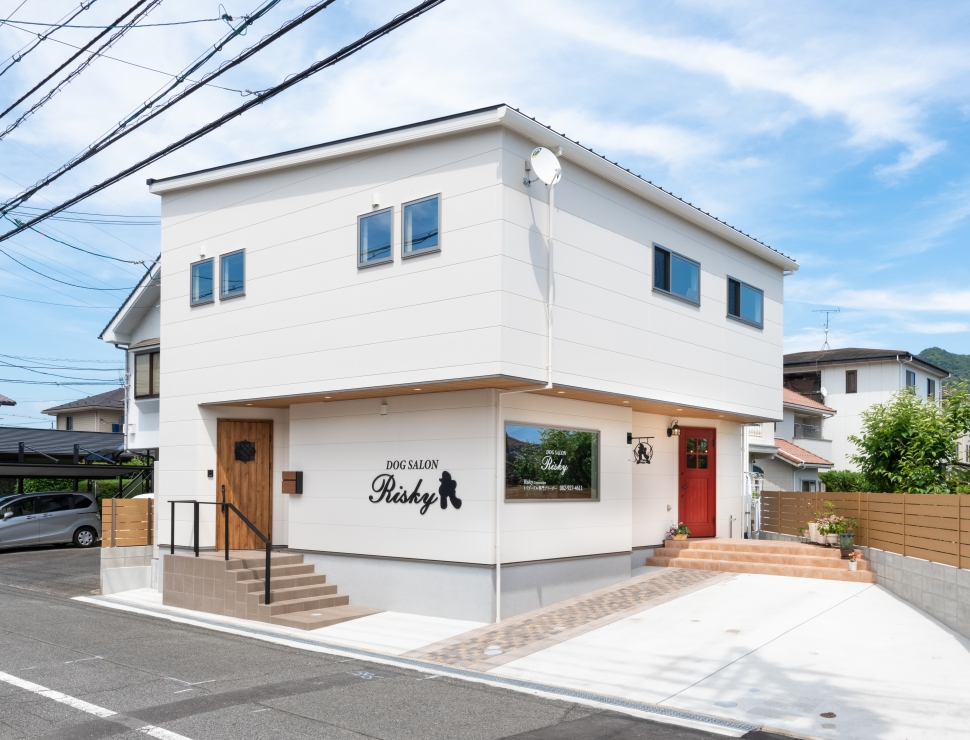 白の外壁と赤い扉が映えるドッグラン併設の外観