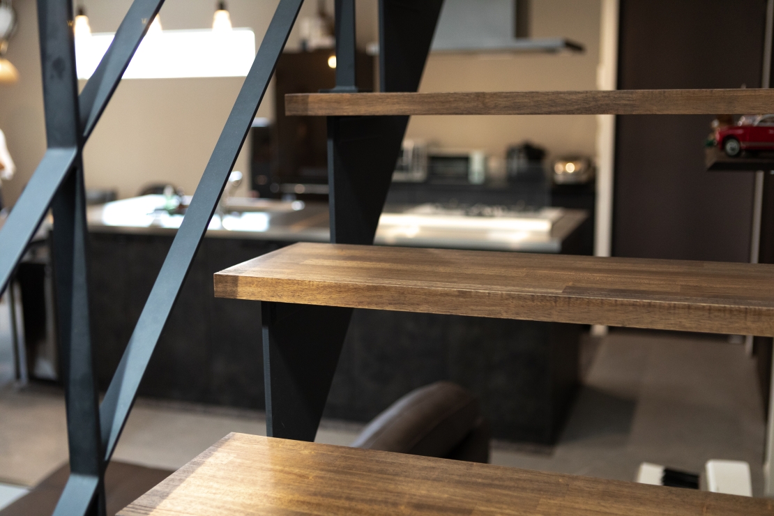黒い鉄骨の階段が白を基調としてカラーコーディネートのアクセントに