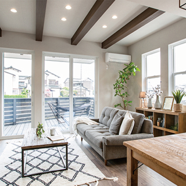 折上天井にて広々と開放的なリビングは、必ず通る動線とし、家族のコミュニケーションの場としています。