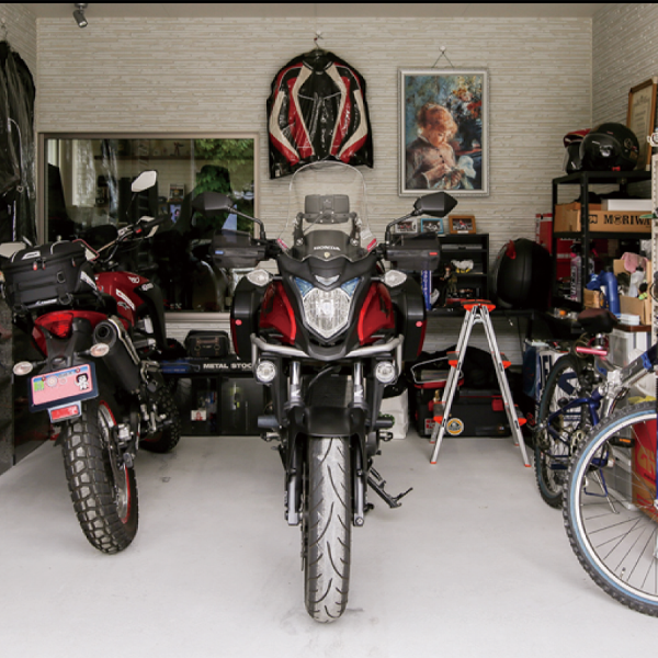 広々としたガレージではバイクのメンテナンスやDIYなど多彩な用途で活用できます。