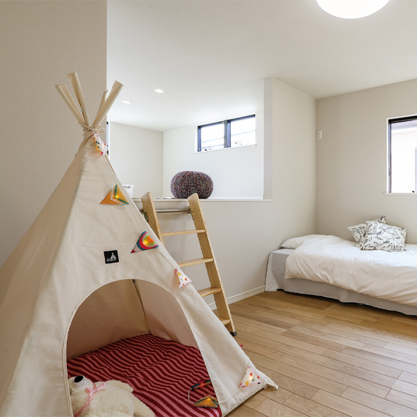 子供の遊び心をくすぐるわくわく空間 土高さ1.4mの大収納スペースは子供部屋から入れるわくわくスペース。パパと子どもたちの遊び心をくすぐります。