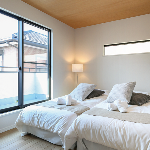 メインベッドルームにはL字型の大型ウォークインクローゼットと奥行きがたっぷりあるバルコニー付き。ガーデンチェアを置いてくつろげます。奥行きがあるのでお部屋に差し込む光を和らげます。