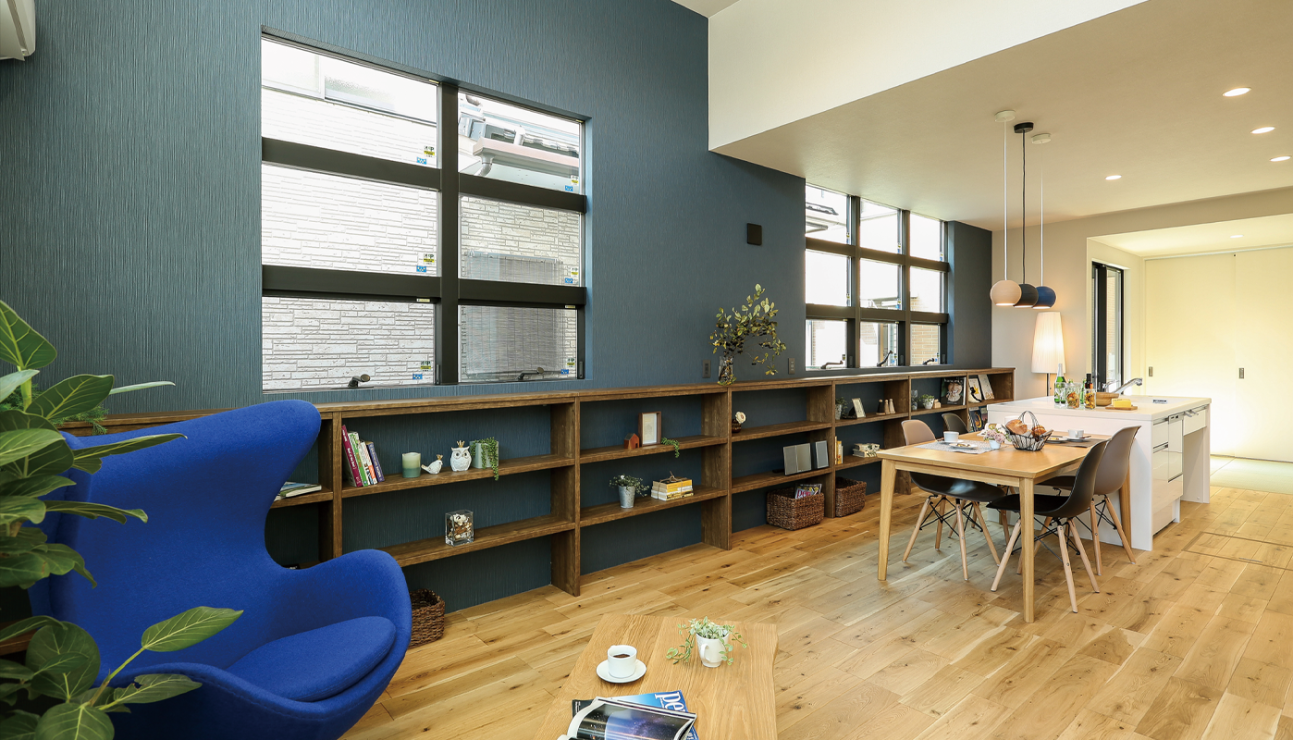 3.4mの高い天井で開放感のあるリビングはアクセントクロスなどで彩り豊かな空間に。まるで、カフェに暮らしているような住まいです。