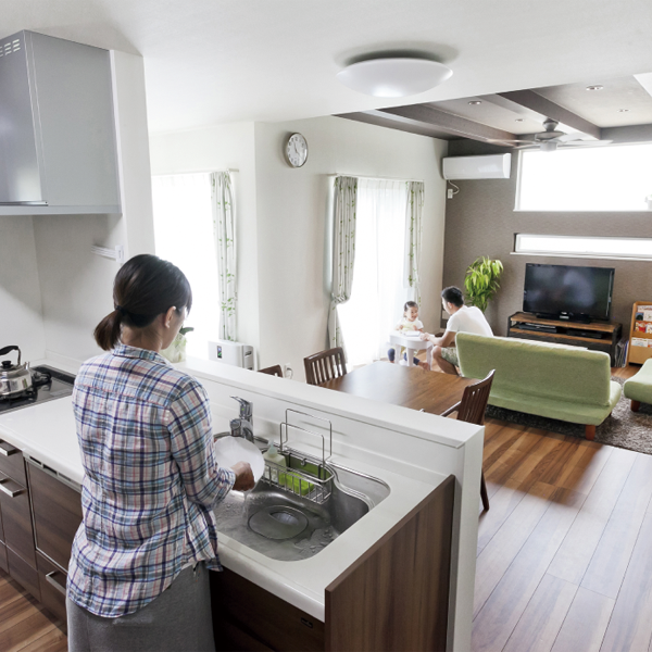 キッチンは背面収納も豊富なので片付けがラクラク。家事をしながら、リビングや畳スペースのお子様の様子が見通せるため安心。