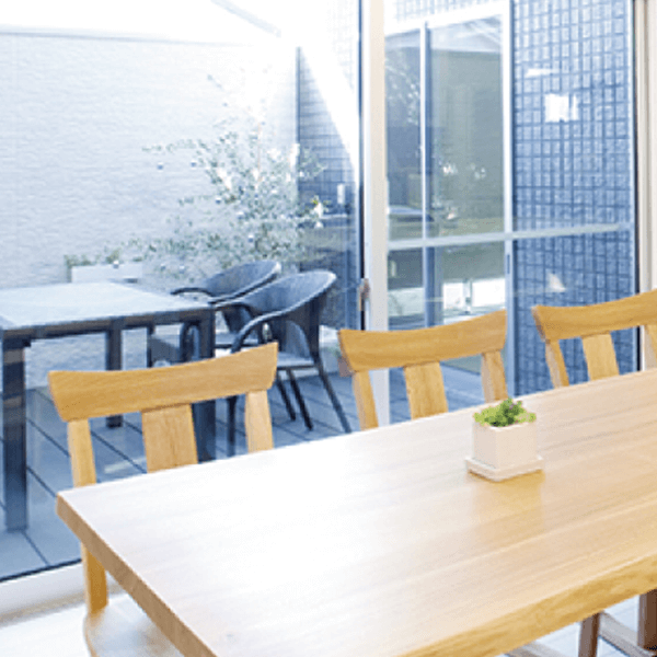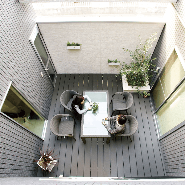 どの部屋からも見渡すことができ、天気の良い日は、青空を見上げながらコーヒーを飲んだりくつろげる憩いの場。そんな時間が過ごせる空間が欲しくて家の中央に8畳のパティオを作りました。バーベキュー用具が収納できるスペースもあります。