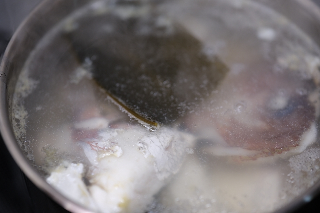調理する前に熱湯をかけて臭みを除き、お鍋に水とだし昆布を入れ、10分かけて沸騰するようゆっくり加熱して味を引き出し、沸騰直前に昆布を引き上げます。