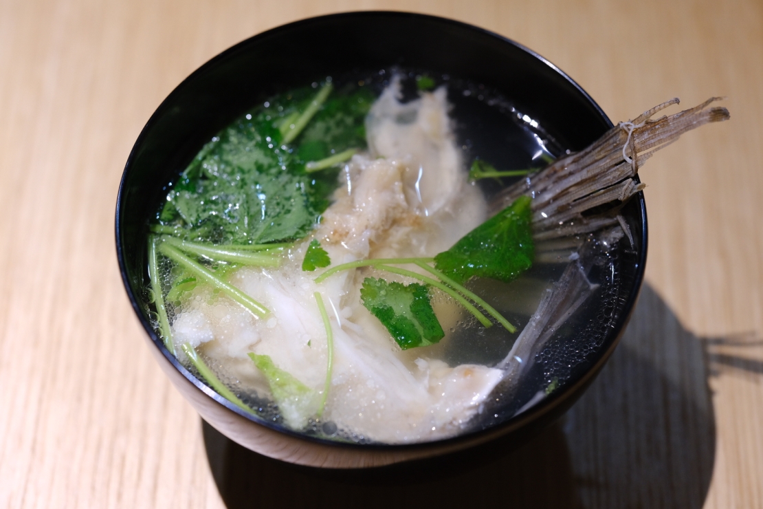 薬味として浜松産ミツバをお椀に入れ、いただく直前に熱々の潮汁をかけます。薬味はネギでも試してみましたが、圧倒的にミツバがお薦めです。