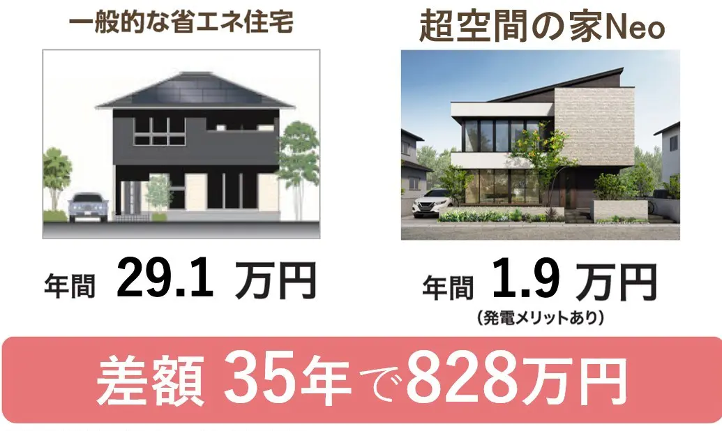さきほどご紹介した全館空調システムや太陽光発電と組み合わせることで、「超空間の家Neo」は、一般的な住宅(UA値=1.54 H4年基準相当)と比べて、35年間で800万円以上の光熱費節約も叶う!という試算もでています。