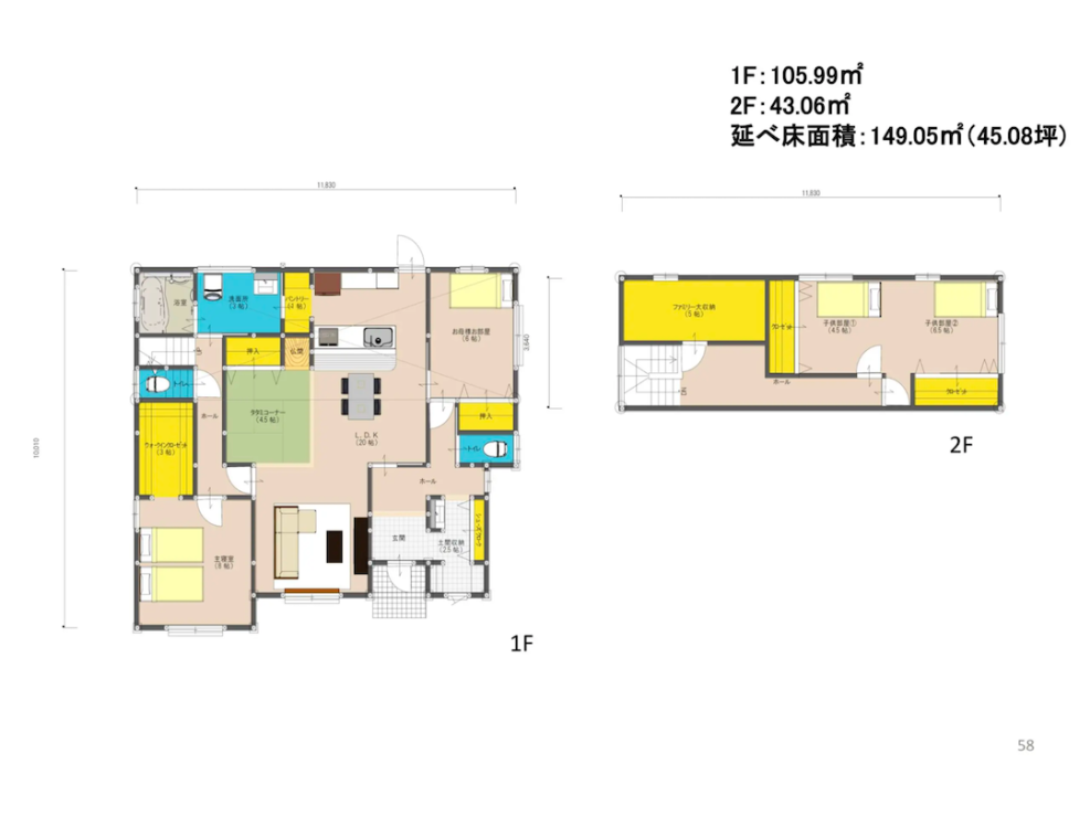 上の間取りでは、2階に子ども部屋とファミリークローゼットのみを配置。1階にはゲストルームと主寝室を配置しています。
