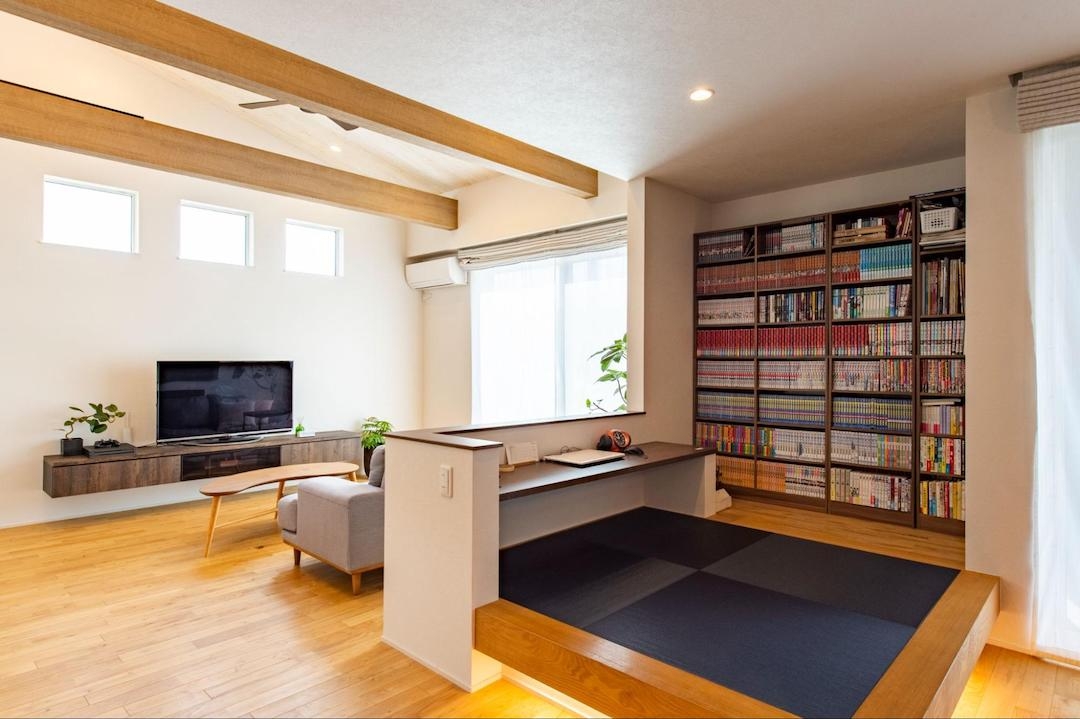 畳コーナーのすぐ隣に壁いっぱいの本棚を造り付け。趣味のマンガや本などをたっぷりしまえます。