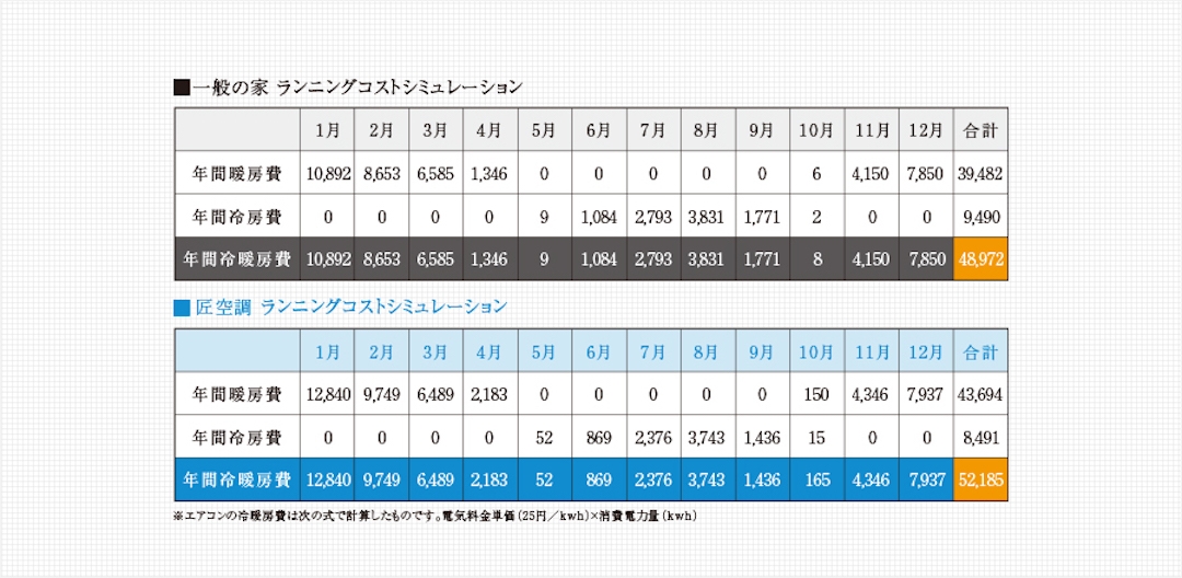 ・個別エアコンと光熱費がほぼ同額(※アキュラホーム「匠空調」の場合)