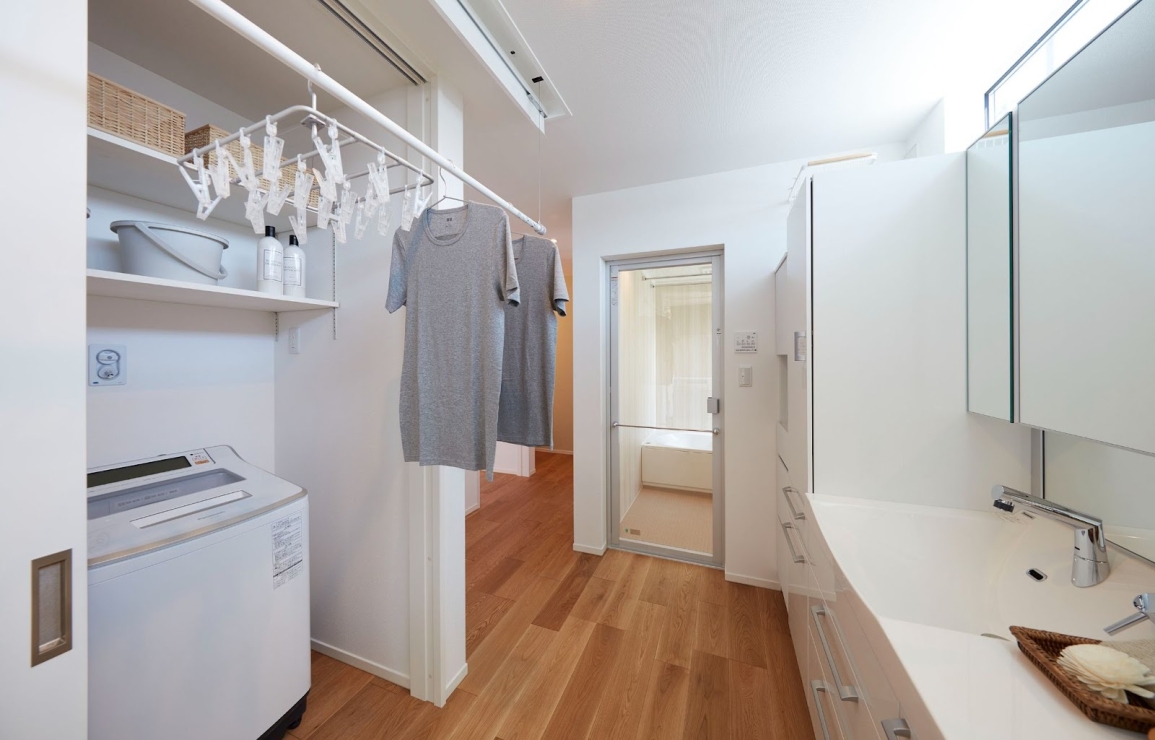 ランドリールームは、洗濯物を洗うだけでなく干したり、アイロンかけをしたり、すぐに使うものは収納したりできる多機能な空間です。洗濯にまつわる家事をここで完結できるようにすることで、日々の家事負担が軽減されます。