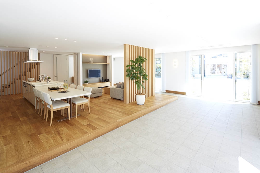 ダウンフロアリビングとは、同じ部屋の中でリビングスペースだけ床が1段低く下げられている空間を指すことばです。