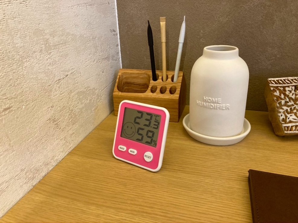 ダイニング横にあるワークコーナーにおいた温・湿度計を見てみると、家の外は湿度80%超えにもかかわらず、なんと59%。人間は、湿度60%くらいから不快に感じるようになると言われていますから、比較的過ごしやすい湿度になっていることがわかります。
