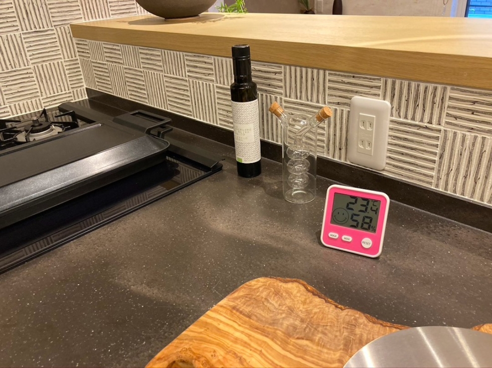 また、キッチンのカウンターの湿度を測ってみると、ダイニングと同じくらいの湿度です。