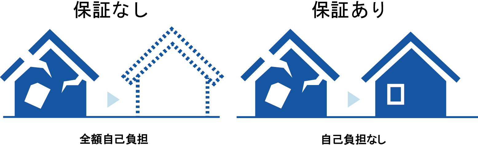 たとえば、震度6の地震がマイホームを襲い、万が一半壊以上になってしまったとしても、地震保証である<地震あんしんサポート>があるから、補修や建替えを保証の範囲内で行うことができるのです(※注)。