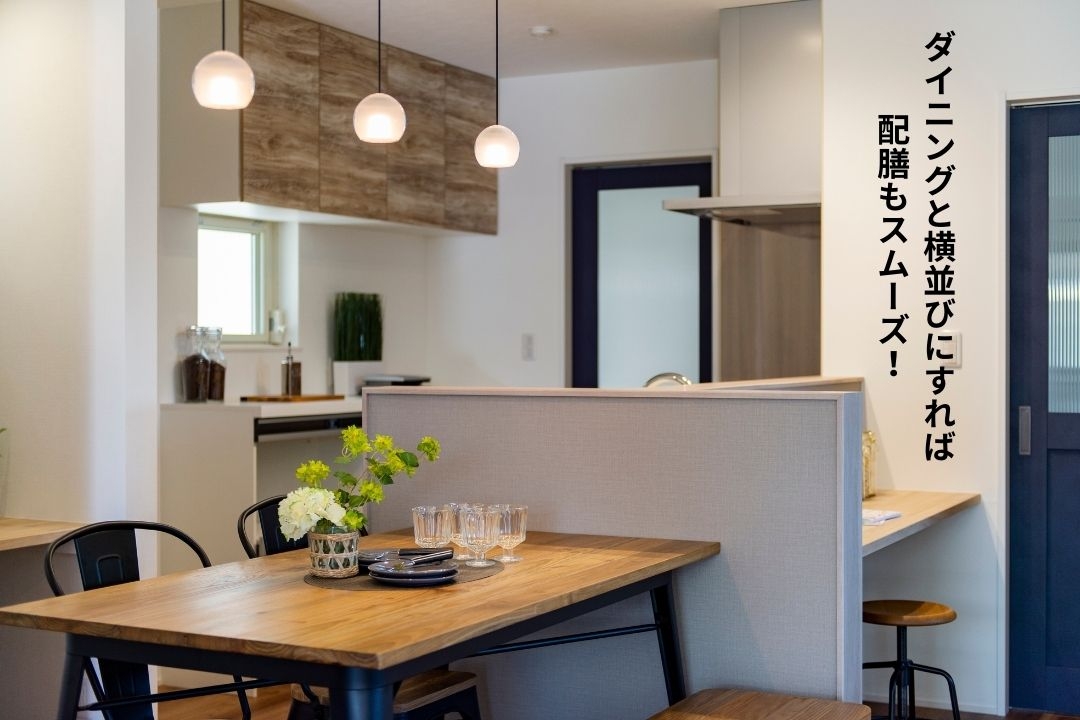 キッチンとダイニングを横並びにすれば、配膳や片付けがしやすく家事もスムーズな間取りに。
