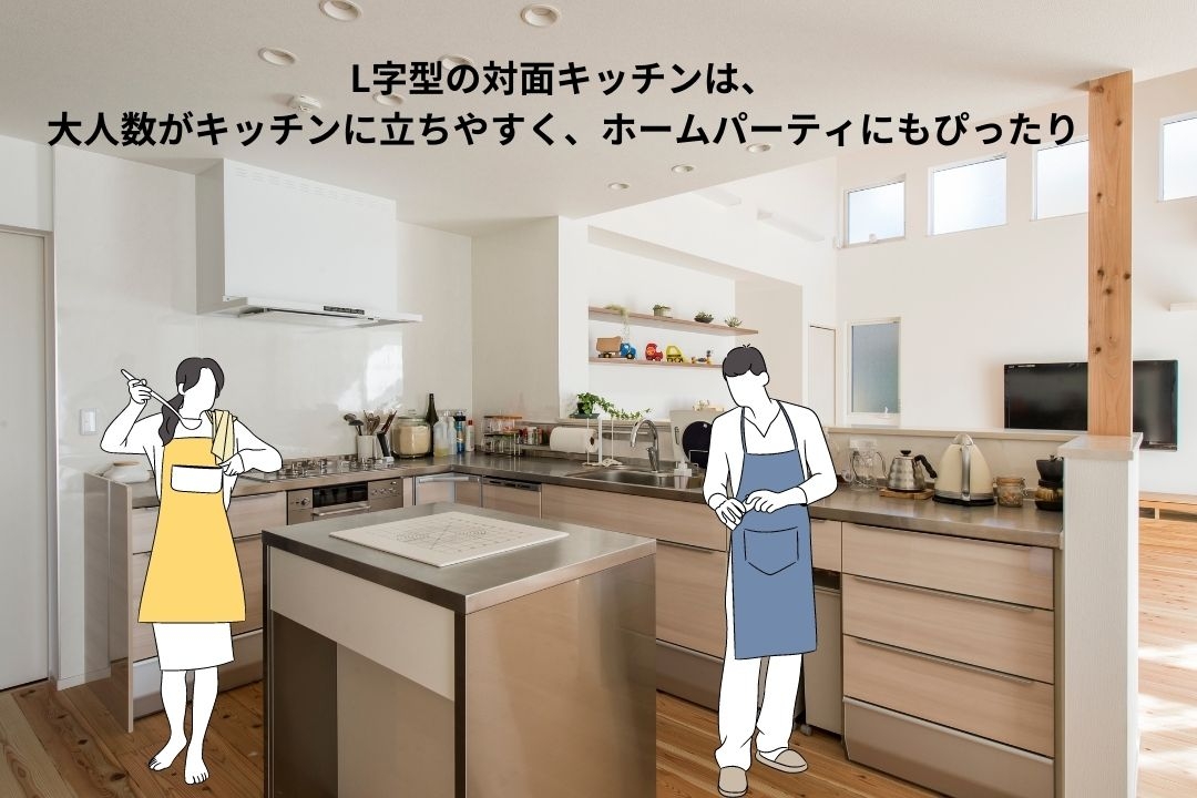 家族みんなでホームパーティーをしたり、一緒にキッチンに立つことが多いなら、対面式キッチンの後ろに作業台を作り、ぐるぐると動き回れる回遊動線をキッチンの中に作るといいでしょう。