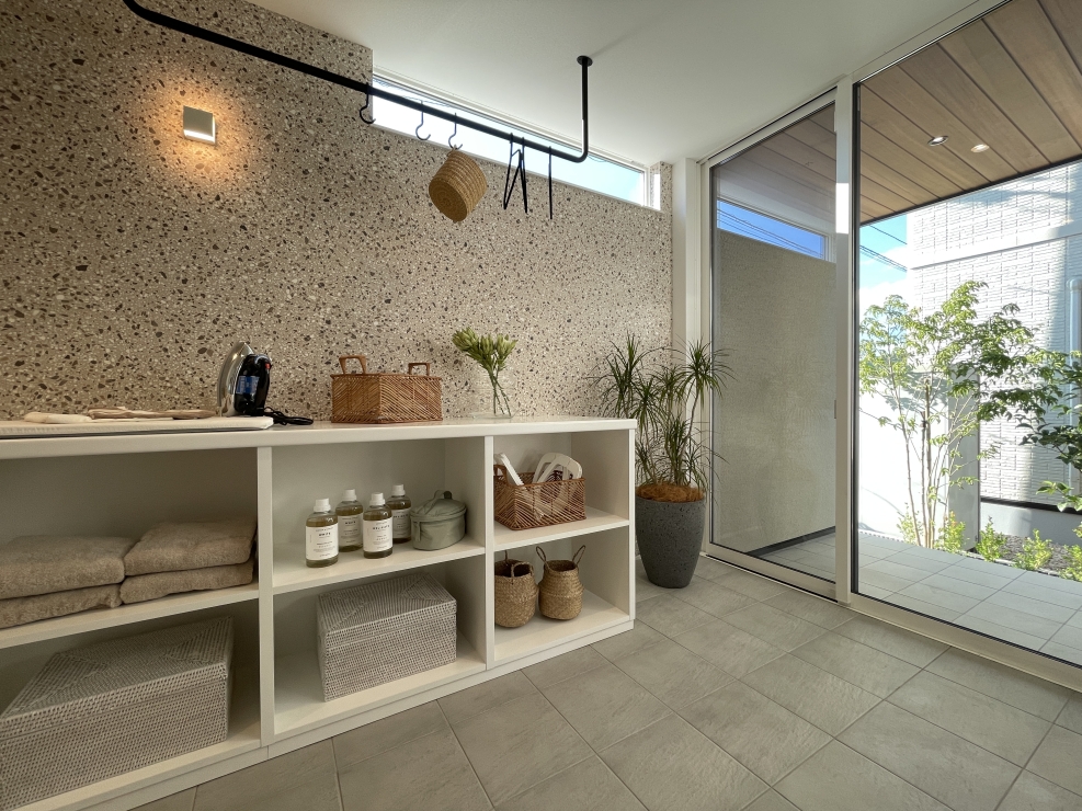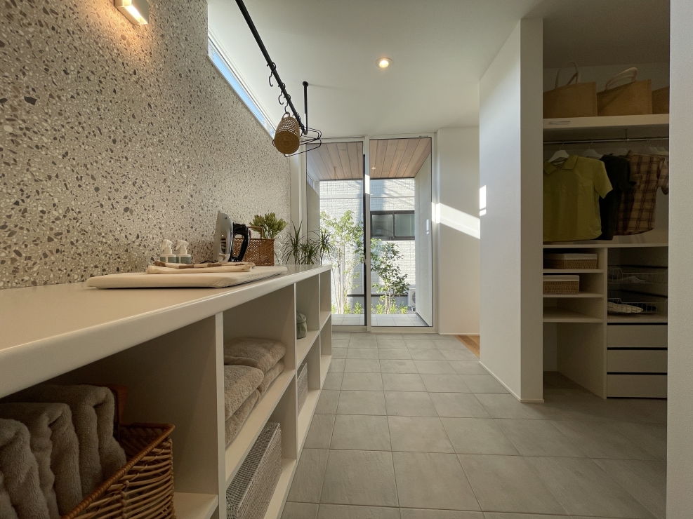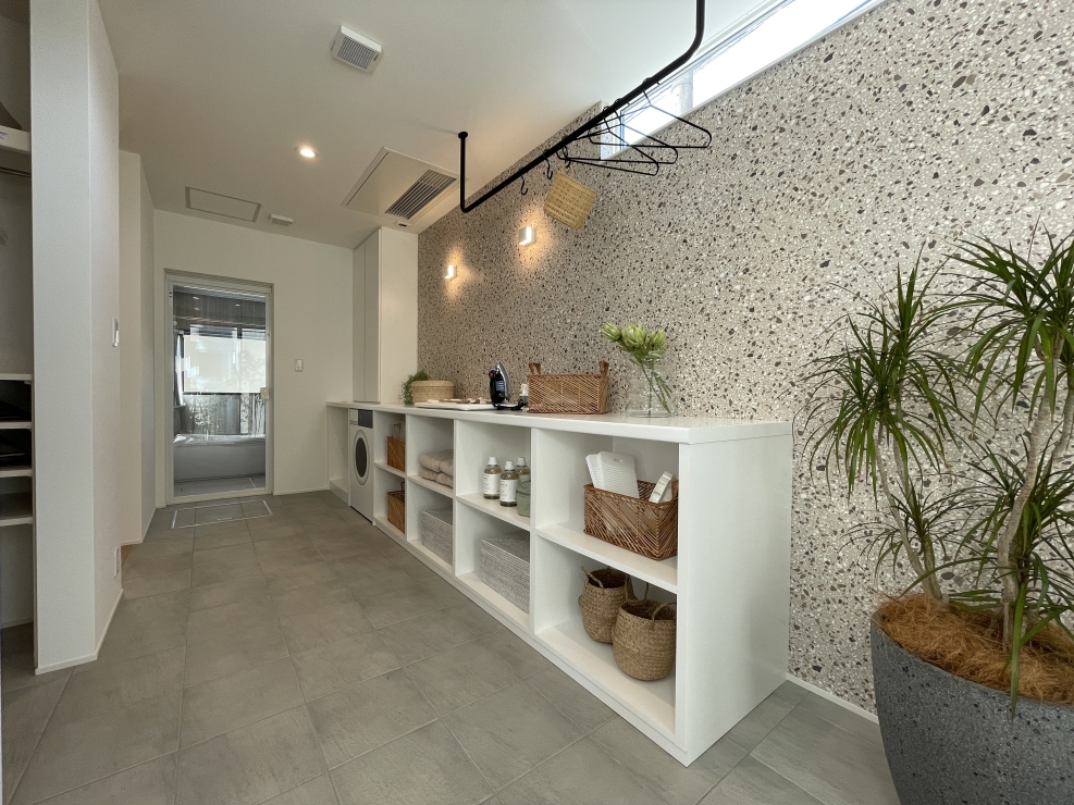 浴室の脱衣室から続くランドリーコーナーは、洗濯機や乾燥機を置けるだけでなく、家族みんなの洗濯物を室内干しするのに十分な広さ。