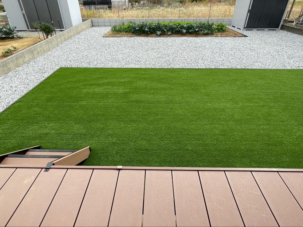 上の写真のお客様邸は、リビングウッドデッキ、そして人工芝のお庭に出られるスタイルを採用しました。広々としたウッドデッキに直接腰掛けてもいいですし、芝スペースにテーブルや椅子を出して過ごせるのがこのお家のいいところ。