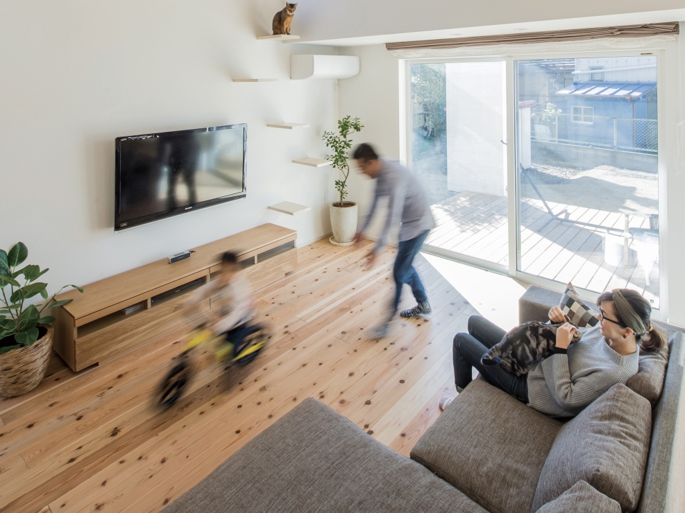 ウッドデッキで過ごす時間を楽しむなら、リビングとのつながりも意識した間取りにしておくと過ごし方の幅が広がりさらに楽しいマイホームに!