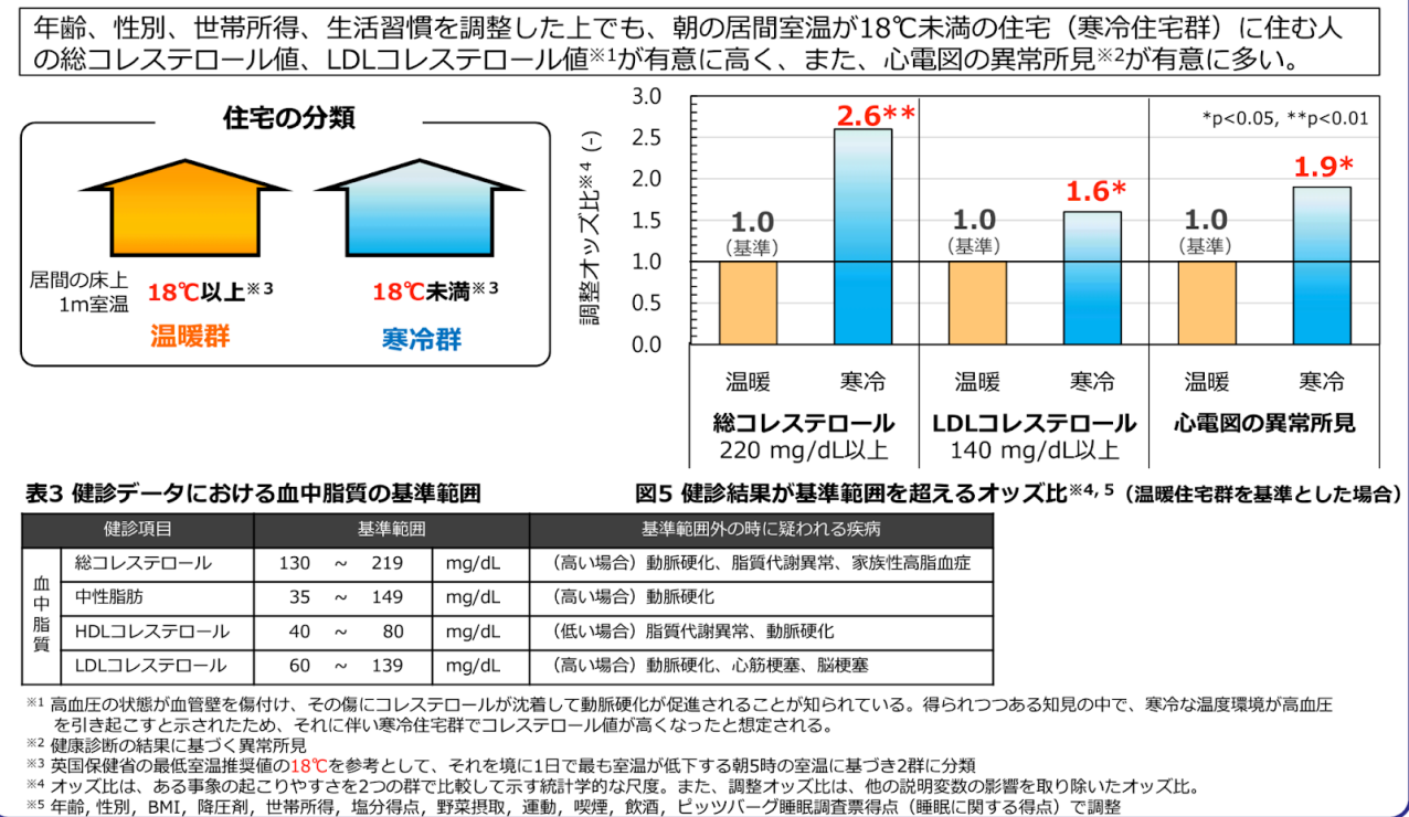 こちらでは、なんと寒い家の方がそうコレステロール値やLDLコレステロール値が高く、心電図の異常所見が見られるケースも多かったそうです。