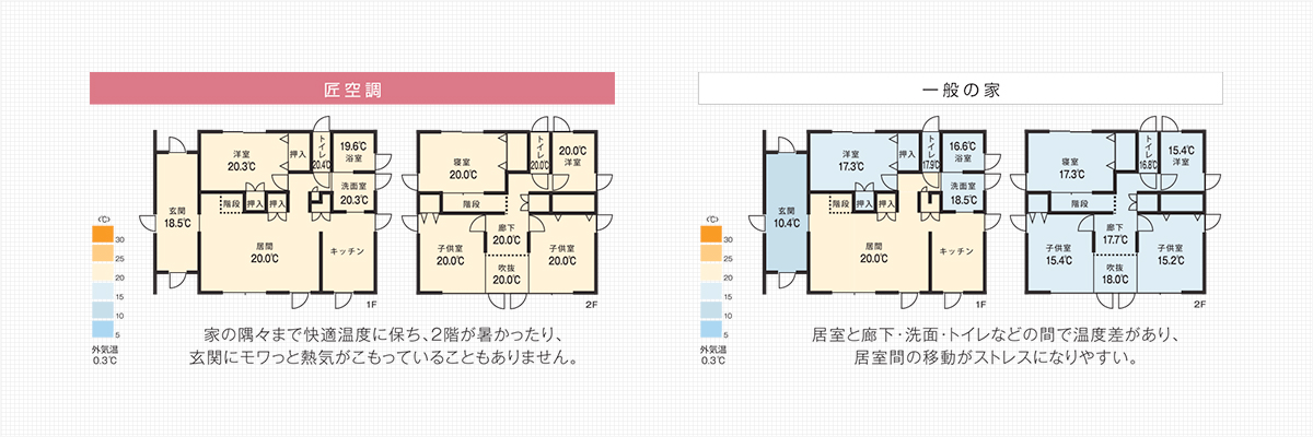 アキュラホームの「匠空調」では、下の図のように家の中ならどこに行っても快適な温度をキープできるようになっています。