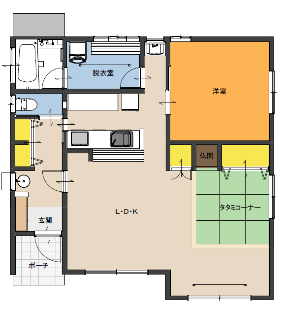 ご夫婦の寝室に加えて、大きな25帖のLDK、そして畳コーナーのある間取りです。
