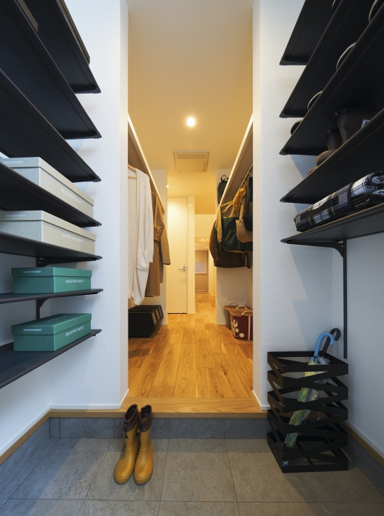 部活道具や傘など、リビングに持ち込まなくてもいいものは、玄関横にまとめておけばスッキリ。リビングがごちゃつく心配もありません。