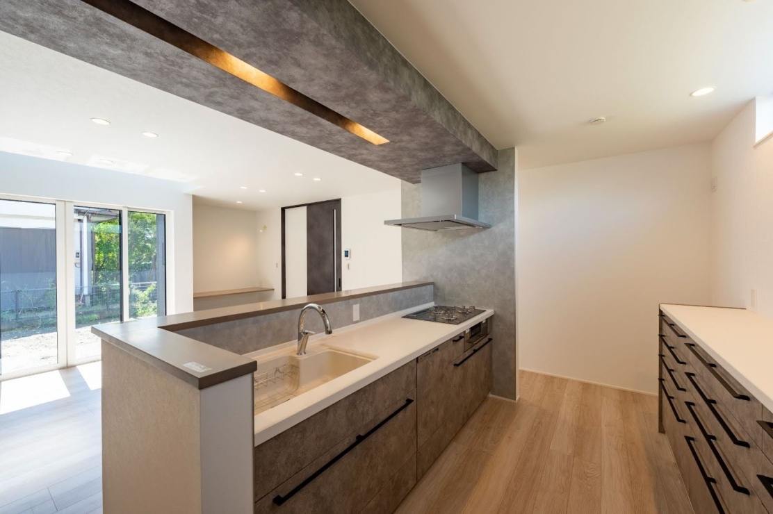 下がり天井部分のクロスはキッチンやカップボードの色と合わせてグレーの石目調にすることで、ダイニングキッチン全体の統一感を演出しています。