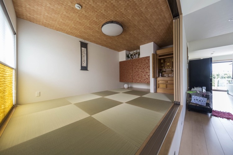 下の写真のオーナーさま邸では、LDKと仕切れる小上がりの畳スペースの天井にナチュラルな素材を採用。