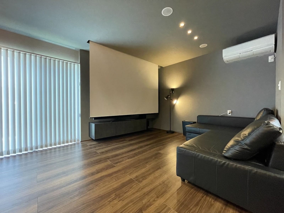 間接照明が映える空間をデザインしました。ゆったりとリラックスしたい日には、天井に埋め込んだスクリーンを下ろして、シアタールームとして活用したいとお話しされていたオーナーさま。シアタールームとして使う際のくつろぎ感を大切に、天井もグレーにして落ち着きあるお住まいを演出しています。