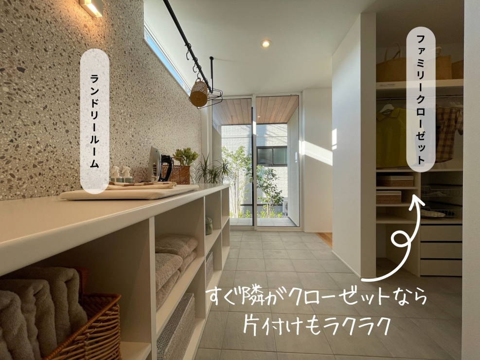 また、ランドリールームで乾燥させた衣類を片付けたり、ランドリールームで服を脱いで洗濯機に入れたらすぐに着替えたりする際には、隣にファミリークローゼットがあると便利。