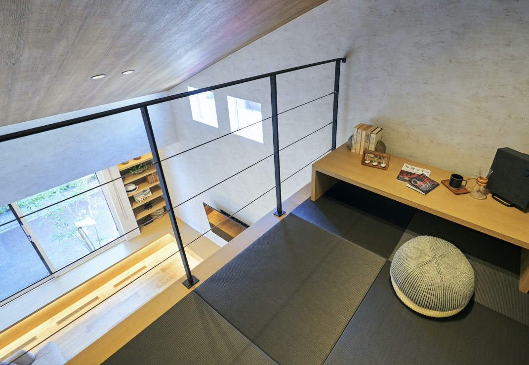 また、写真左側にある摺りガラスは上部が少し空いていて吹き抜けから空気が入るようになっています。ロフトでつけたエアコンの涼しい風が、少しずつ吹き抜けを通じてロフトから下の階へと流れるようにすれば、ロフトだけでなく下のフロアの空気も快適になるというわけです。