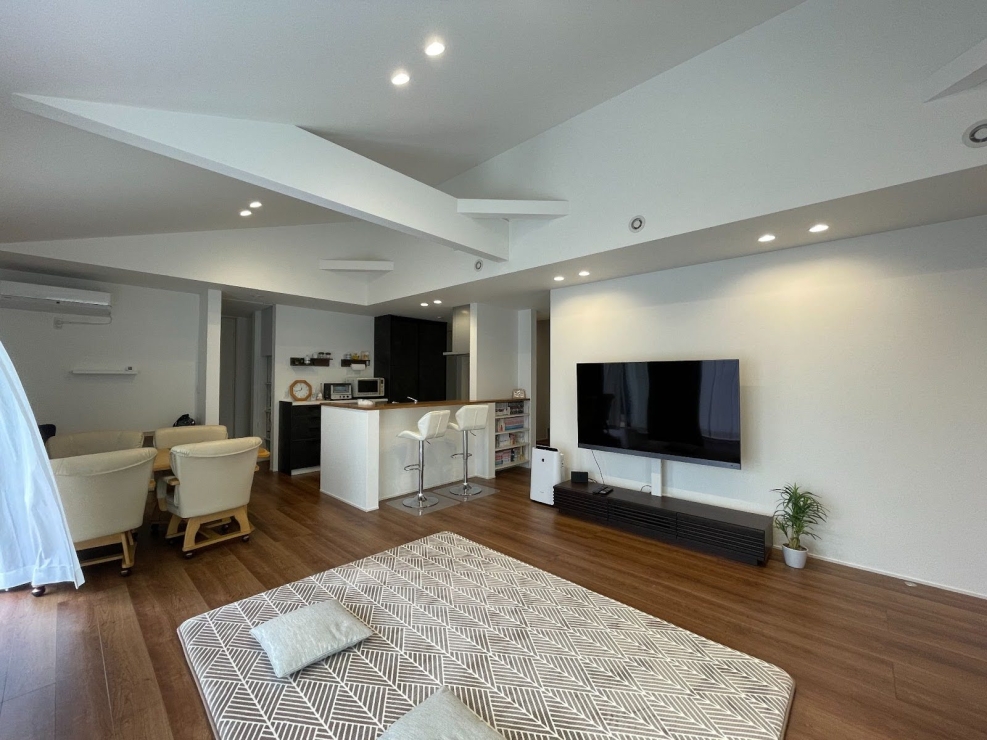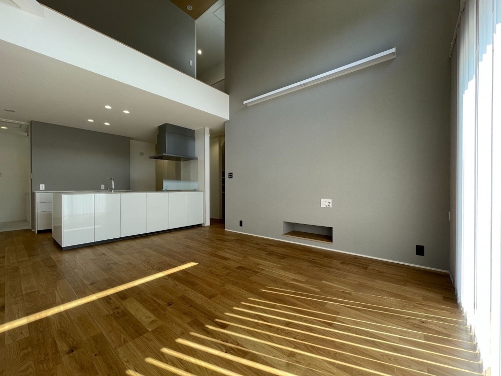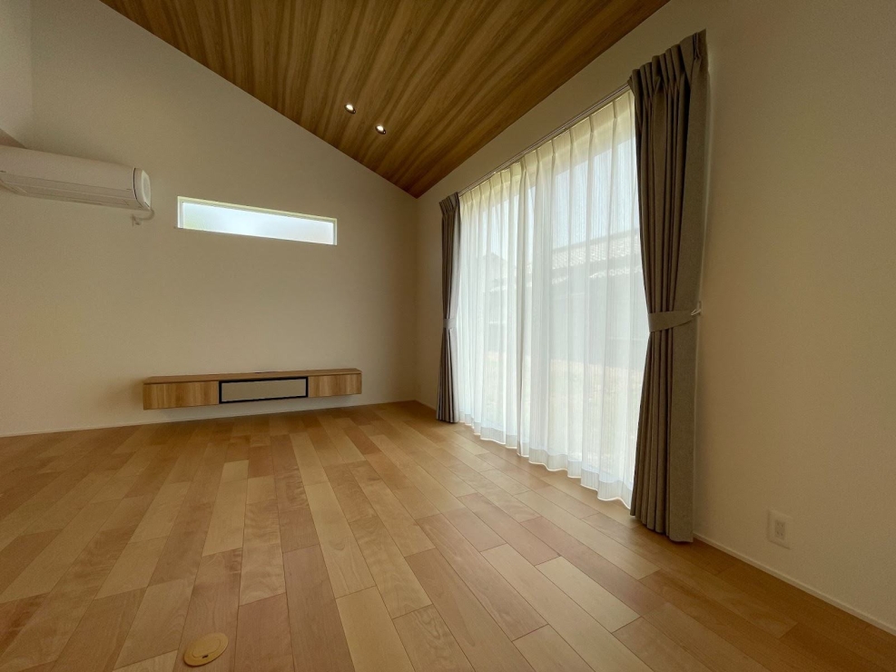 また、テレビボードは床に直置きするのではなく壁に取り付けた造作スタイルがおすすめ。