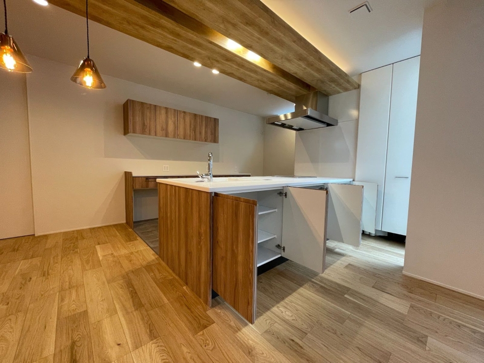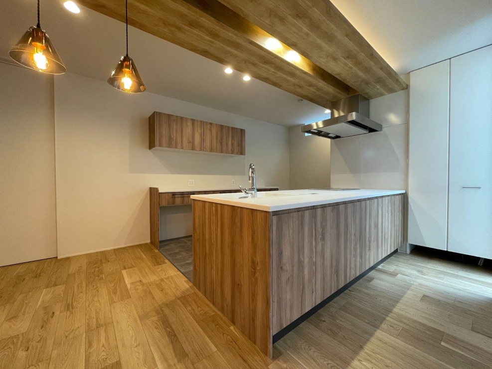 上の写真のような、開放的なLDK空間を作る際、キッチンの天板が全て平らにダイニングやリビングへとつながるのが魅力です。